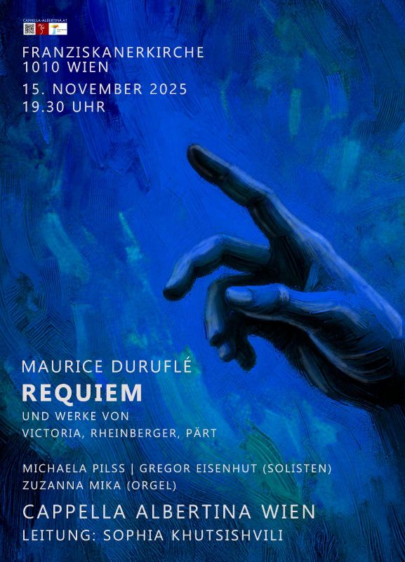 Tomás Luis de Victoria (ca. 1548 - 1611) Lux aeterna Josef Rheinberger (1839 - 1901) Abendlied (Op. 69, Nr. 3) Maurice Duruflé (1902 - 1986) Requiem (op. 9) Arvo Pärt (*1935) Da pacem Domine Zuzanna Mika, Orgel Cappella Albertina Wien Franziskanerkirche, Wien 1, Franziskanerplatz 4 Ermäßigte Vorverkaufskarten können bis 12. November unter Diese E-Mail-Adresse ist vor Spambots geschützt! Zur Anzeige muss JavaScript eingeschaltet sein! um €20,- bestellt werden. Karten zu €25,- (Studierende €10,-) sind am 15. November ab 17 Uhr direkt an der Abendkassa erhältlich. Kinder bis 14 Jahre in Begleitung eines Erwachsenen gratis. Freie Platzwahl |