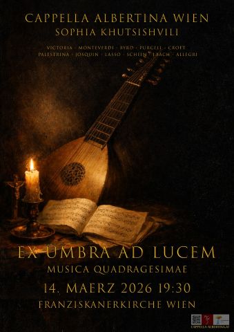 Tomás Luis de Victoria (ca. 1548 - 1611) Claudio Monteverdi (1567 - 1643) William Byrd (1543 - 1623) Henry Purcell (1659 - 1695) William Croft (1678 - 1727) Giovanni Pierluigi da Palestrina (1525 - 1594) Josquin des Préz (ca. 1450 - 1521) Orlando di Lasso (1532 - 1594) Johann Hermann Schein (1586 - 1630) Johann Bach (1604 - 1673) Gregorio Allegri (1582 - 1632 Cappella Albertina Wien Franziskanerkirche, Wien 1, Franziskanerplatz 4 Ermäßigte Vorverkaufskarten können bis 11. März unter Diese E-Mail-Adresse ist vor Spambots geschützt! Zur Anzeige muss JavaScript eingeschaltet sein! um €20,- bestellt werden. Karten zu €25,- (Studierende €10,-) sind am 14. März ab 17 Uhr direkt an der Abendkassa erhältlich. Kinder bis 14 Jahre in Begleitung eines Erwachsenen gratis. Freie Platzwahl |